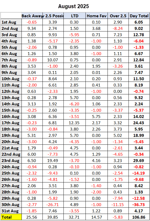 And the results are below, for the 29th August, 2022 Lay the Draw Summary: 5 Matches, Draw Lay all five are winning bets, 4.75 after Comission And the Over 2.50 we win 4 of the 5 Backing the 2.50 plus scoreline. 2.06 points after comms. And time to get these selections under 15 seconds. Watch the video: (3 Minutes)