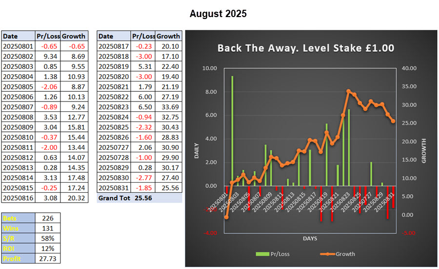For back the away " We keep things 100% transparent by showing results at level stakes—even if that means a small loss. Many of the matches odds are very low and you would not mostly bet them. But look closely: a 72–78% strike rate across 100+ bets is an incredible edge. The reason for the loss is simply the odds structure at level stakes. With any sensible staking plan, that strike rate converts into strong, long-term profits. The edge is real—it’s just about staking smart to unlock it. |