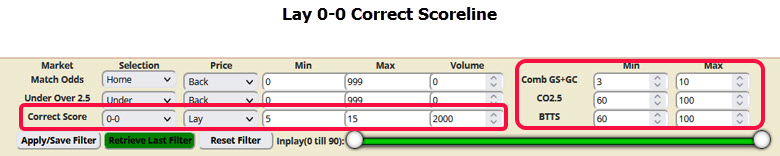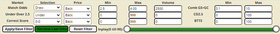 If you want to find inplay matches on a busy weekend you can use the InPlay time bar. We have set the example below to show all matches that are currently at 60 minutes to 90 minutes, as it is 3.28GMT time, there is only this one in Honduras. The Honduras match is at 67 minute, and the score is 0-0 away team opened as fav at 2.50, now it is at 4.60 these prices are live from Betfair. Great feature if you want to bet from halftime, or very late and lay say the correct score if the Combined Goals are high. Correct Score: If you want to lay maybe the 1-0 scoreline, but the lay odds must be 5.00 to 7.00, and Both Team To Score percentage over 50%. So in the past these teams have been in matches where 50% of the time both teams have scored, so a 1-0 scoreline is in danger. And below you will see 3 of the 5 matches both teams scored, and all 5 lays were successful. To find these 5 matches with Soccer Price Monitor would have taken half the day, this took less that a minute.